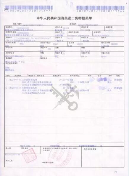 中國海關(guān)出具的報(bào)關(guān)單產(chǎn)品品名為:生物降解清洗劑