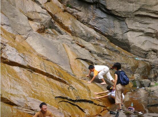 進入景區(qū),迎面就是景區(qū)管理站天泉山莊,山莊往前走就是一片原生態(tài)的天然美景,幽谷峰秀,天青水白,怪石流水。大家三五成群的結(jié)伴在山谷里前行,就像是行走在畫里一樣。道路兩旁是溪水和灌木,孩子們時不時蹲下用手去撩撥水里的小魚,大人們則一邊欣賞山色美景,一邊為孩子們照相留影。人們就這樣行走在湖光山色之間,大家一路游覽了古廟、仙人石、瀑布水潭等景觀。時間不知不覺的在人們愉快的交談和孩子們的嬉戲打鬧中過去了。臨近午后,大家三五成群的回到天泉山莊,并在那里午飯休息。男士吃飯喝酒氣氛熱烈,女士嘮家常、品服飾悠閑愜意。孩子們玩耍嬉戲樂而忘返。