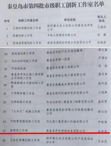 秦皇島華電測控設(shè)備有限公司“崔明思工作室”被秦皇島市勞動(dòng)競賽委員會命名為第四批市級職工創(chuàng)新工作室。