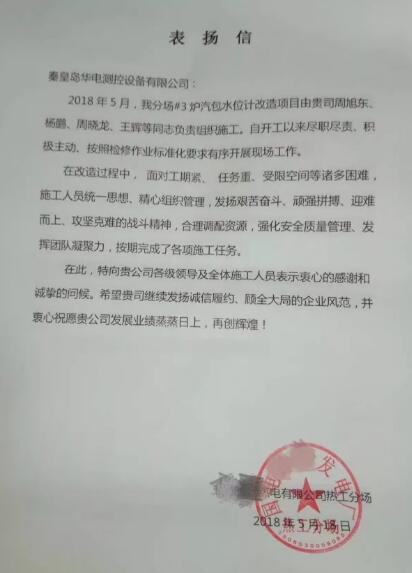 2018年5月18日,公司再次收到來(lái)自國(guó)電某發(fā)電廠的一封表?yè)P(yáng)信。信中,甲方對(duì)公司全體施工人員盡職盡責(zé)、積極主動(dòng)、規(guī)范有序的態(tài)度和精神提出嘉許。信中提到:“在改造過(guò)程中,面對(duì)工期緊、任務(wù)重、受限空間等諸多因素,施工人員統(tǒng)一思想、精心組織管理,發(fā)揚(yáng)艱苦奮斗、頑強(qiáng)拼搏、迎難而上、攻堅(jiān)克難的戰(zhàn)斗精神,合理調(diào)配資源,強(qiáng)化安全質(zhì)量管理、發(fā)揮團(tuán)隊(duì)凝聚力,按期完成了各項(xiàng)施工任務(wù)?!?/FONT>