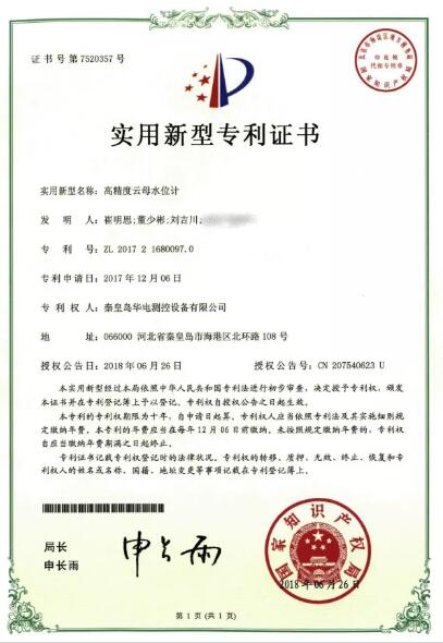 公司于2017年12月6日提交的“高精度云母水位計(jì)”(專利號(hào):ZL 201721680097.0)專利已被中華人民共和國(guó)國(guó)家知識(shí)產(chǎn)權(quán)局頒發(fā)專利證書(shū),授權(quán)公告日為2018年6月26日,授權(quán)公告號(hào):CN 207540623 U。