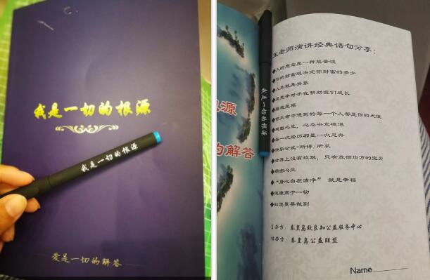 學(xué)習(xí)中,每個(gè)人手握著筆,告訴你“我是一切的根源”;手里拿著的筆記本,告訴你“我是一切的根源”;耳朵聽到的是“我是一切的根源”;眼睛看到的是“我是一切的根源”。讓整個(gè)人從觸摸到看到聽,身心合一地去感悟“我是一切的根源”。