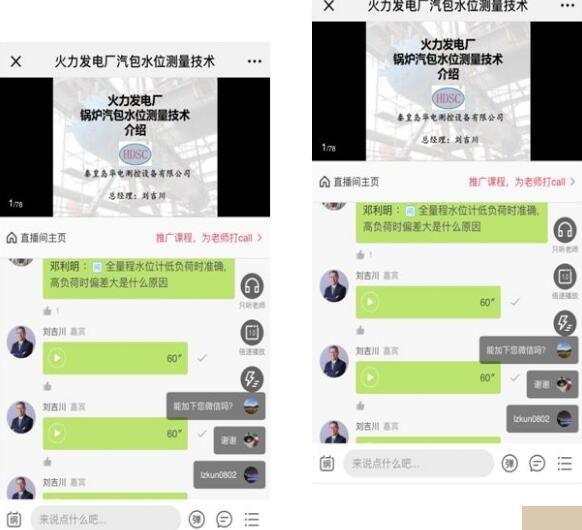 直播課程通過語(yǔ)音與PPT相結(jié)合,向大家詳細(xì)的講解了汽包水位測(cè)量系統(tǒng)技術(shù)規(guī)程的必要性、汽包水位測(cè)量系統(tǒng)改造必要性、汽包水位測(cè)量系統(tǒng)的問題及技術(shù)難點(diǎn)、如何解決、改造效果。為大家分享經(jīng)驗(yàn),直播最后20分鐘劉吉川總經(jīng)理現(xiàn)場(chǎng)為熱控技術(shù)人員進(jìn)行答疑解惑,解決了他們心中的疑慮,得到了技術(shù)人員的積極響應(yīng)和高度評(píng)價(jià)。