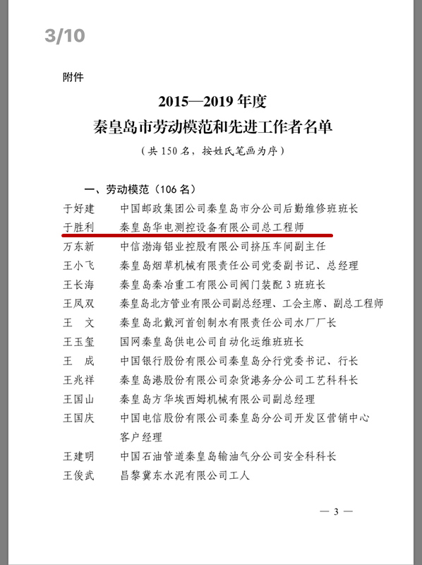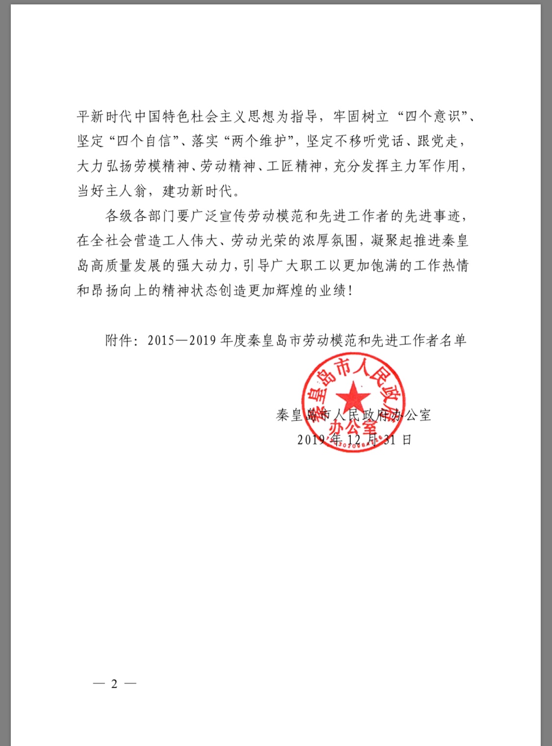 秦皇島市人民政府辦公室于2020年 1月3日向我公司下發(fā)《關(guān)于命名表彰2015-2019年度秦皇島市勞動模范和先進(jìn)工作者的決定》,公司總工程師于勝利被評為秦皇島市勞動模范。