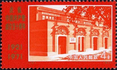 1971年7月1日發(fā)行的編12―20《慶祝中國(guó)共產(chǎn)黨成立50周年》紀(jì)念郵票,全套6枚。其中第1枚是“中共一大會(huì)址”,由許彥博設(shè)計(jì),影寫(xiě)版,主圖為“一大會(huì)址”外景,畫(huà)面邊框采用紅底金字,表示建黨50周年的熱烈吉慶。在構(gòu)圖上突出了掛在自左第一、二扇門(mén)之間的石牌,牌上鐫刻著“中國(guó)共產(chǎn)黨第一次全國(guó)代表大會(huì)會(huì)址”、“全國(guó)重點(diǎn)文物保護(hù)單位”和“中華人民共和國(guó)國(guó)務(wù)院一九六一年三月四日公布”字樣。 《慶祝中國(guó)共產(chǎn)黨成立50周年》郵票首次“不走樣”地展現(xiàn)了中共一大會(huì)址的外景,整個(gè)票面紅彤彤的,象征著黨從這座石庫(kù)門(mén)中誕生,一路走來(lái)、走向輝煌的歷程。