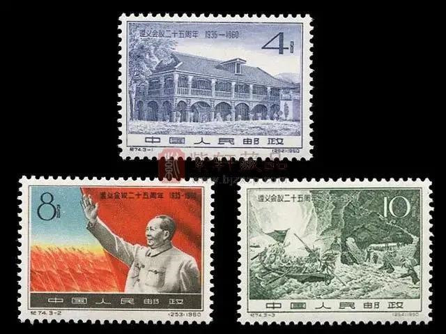 1960年1月25日,當(dāng)時(shí)的郵電部發(fā)行了紀(jì)74《遵義會(huì)議二十五周年》紀(jì)念郵票一套,全套三枚,圖案分別為“遵義會(huì)議會(huì)址”、“在毛澤東旗幟下永遠(yuǎn)勝利地前進(jìn)”、“強(qiáng)渡金沙江”。3枚郵票上均標(biāo)有“遵義會(huì)議二十五周年1935―1960”字樣。
