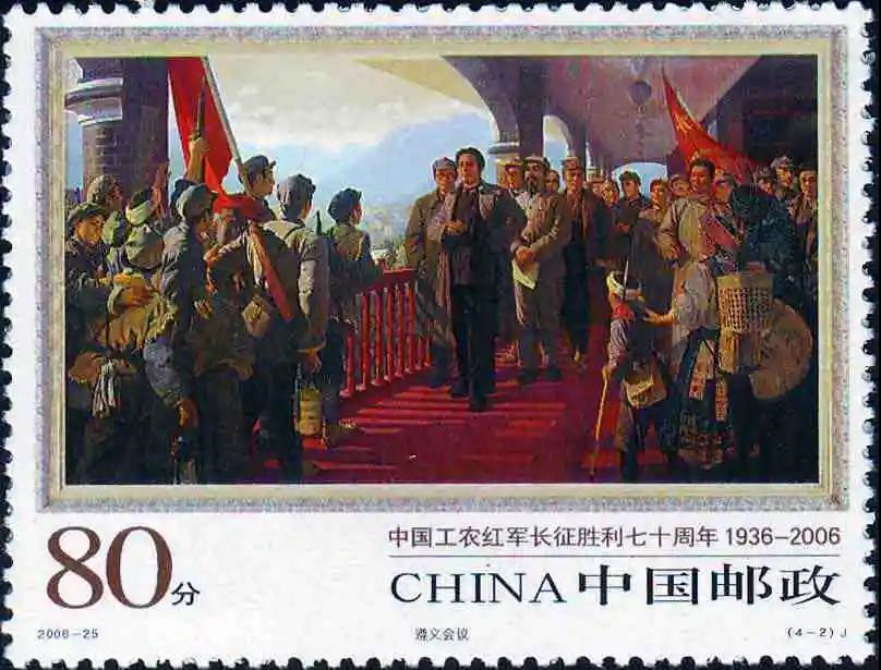 遵義會(huì)議作為紅軍長(zhǎng)征途中的重要會(huì)議,也曾出現(xiàn)在2006年10月22日發(fā)行的《中國(guó)工農(nóng)紅軍長(zhǎng)征勝利七十周年》的紀(jì)念郵票1套4枚中。志號(hào):2006-25,設(shè)計(jì)者:郝旭東。畫作者:靳尚誼(4-1)、彭 彬(4-2)、劉國(guó)樞(4-3)、張文源(4-4)、李寶林周順愷(小型張)。