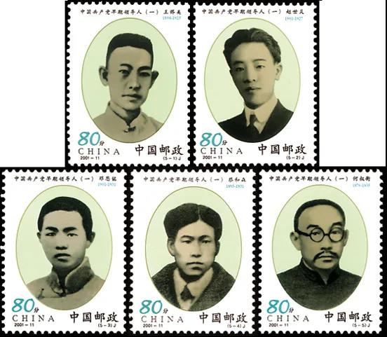 中國共產(chǎn)黨早期組織的創(chuàng)建者和早期領(lǐng)導(dǎo)人王盡美、趙世炎、鄧恩銘、蔡和森、何叔衡,就是這些千千萬萬個共產(chǎn)黨員中的杰出代表。為深切緬懷這些革命先驅(qū)者的光輝業(yè)績,學(xué)習(xí)繼承和發(fā)揚(yáng)他們的崇高精神,國家郵政局特于2001年6月28日發(fā)行了《中國共產(chǎn)黨早期領(lǐng)導(dǎo)人(一)》郵票一套5枚。
