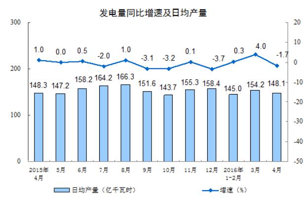 中國電力網(wǎng)訊 (記者齊濤)5月14日,國家統(tǒng)計(jì)局發(fā)布數(shù)據(jù)稱, 2016年4月份規(guī)模以上工業(yè)增加值增長6.0%,其中,發(fā)電量4444億千瓦時(shí),下降1.7%。
