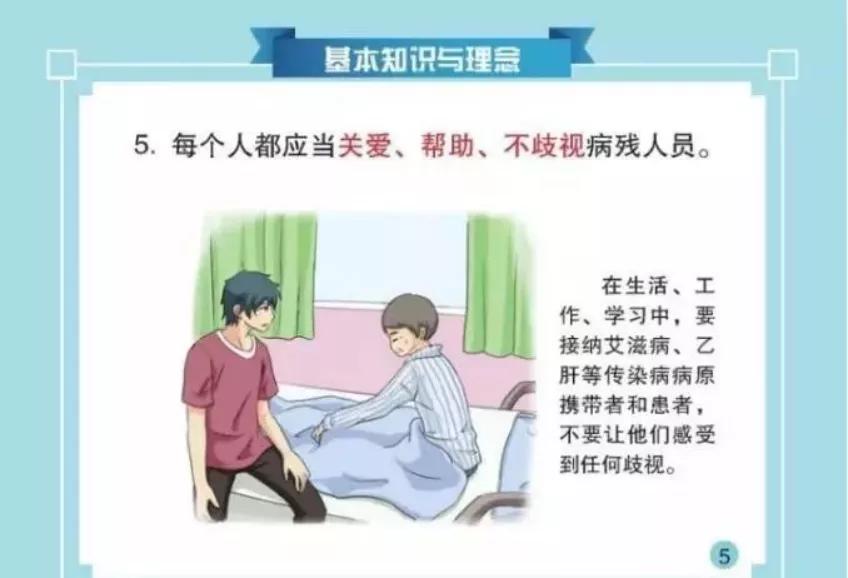 艾滋病、乙肝等傳染病病原攜帶者,精神障礙患者,殘疾人都應(yīng)得到人們的理解、關(guān)愛和幫助,這不僅是預(yù)防、控制疾病流行的重要措施,也是人類文明的表現(xiàn),更是經(jīng)濟(jì)、社會發(fā)展的需要。在生活、工作、學(xué)習(xí)中,要接納艾滋病、乙肝等傳染病病原攜帶者和患者,不要讓他們感受到任何歧視。要鼓勵他們和疾病作斗爭,積極參與疾病的防治工作。對精神障礙患者,要積極幫助他們回歸家庭、社區(qū)和社會;患者的家庭成員要積極幫助他們接受治療和康復(fù)訓(xùn)練,擔(dān)負(fù)起照料和監(jiān)護(hù)責(zé)任。對殘疾人和康復(fù)后的精神障礙患者,單位和學(xué)校應(yīng)該理解、關(guān)心和接納他們,為他們提供適當(dāng)?shù)墓ぷ骱蛯W(xué)習(xí)條件。