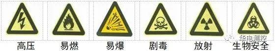危險標識由安全色,幾何圖形和圖形符號構(gòu)成,用以表達特定的危險信息,提示人們周圍環(huán)境中有相關(guān)危險因素存在。常見的危險標識包括高壓、易燃、易爆、劇毒、放射、生物安全等。