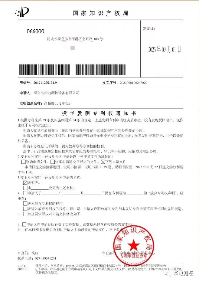 2023年9月1日,秦皇島華電測控設備有限公司自主研發(fā)的“高精度云母水位計”喜獲國家發(fā)明專利!