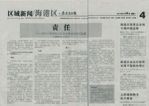2015年7月6日,秦皇島日報第四版,以《責任》為題大篇幅報道了秦皇島華電測控設備有限公司總經(jīng)理劉吉川先生的個人思想和創(chuàng)業(yè)經(jīng)歷。在此之前,劉總也曾多次被《燕趙都市報》、《秦皇島日報》、《秦皇島晚報》等媒體采訪和報道。以下為報道內(nèi)容: