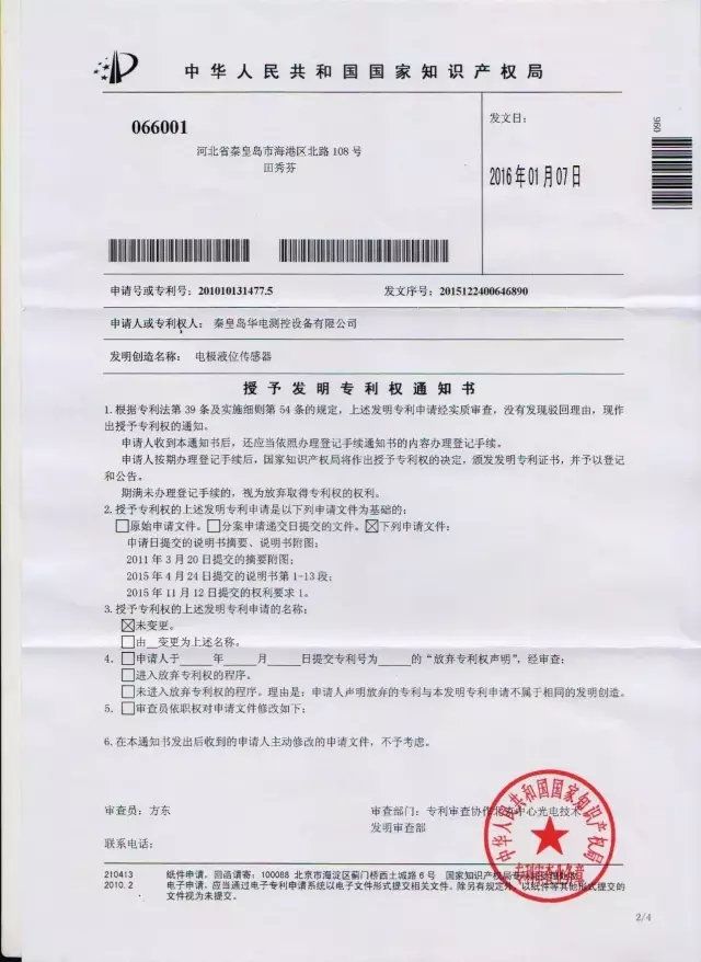 新年伊始,佳音頻傳。公司于2010年2月26日提交的“電極液位傳感器”專利已被中華人民共和國國家知識(shí)產(chǎn)權(quán)局授權(quán)發(fā)明專利權(quán)。