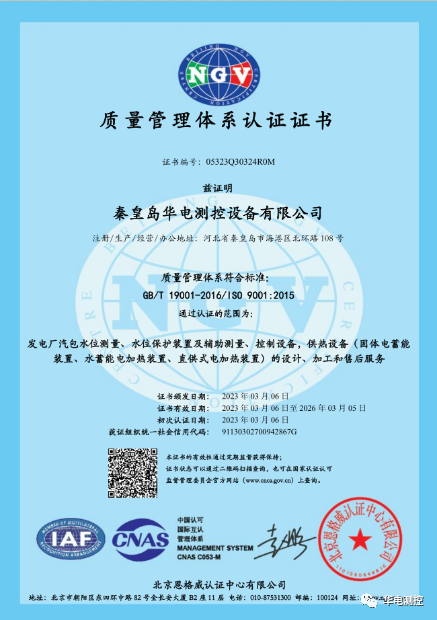 華電測控順利通過ISO9001質(zhì)量管理體系再認(rèn)證” 2023-03-072023年3月7日,秦皇島華電測控設(shè)備有限公司收到來自北京恩格威認(rèn)證中心頒發(fā)的《質(zhì)量管理體系認(rèn)證證書》,這表明華電測控2023年ISO9001質(zhì)量管理體系再認(rèn)證順利通過!秦皇島華電測More