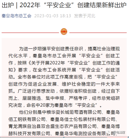 2022年,為進(jìn)一步增強(qiáng)企業(yè)安全生產(chǎn)主體責(zé)任和全員安全責(zé)任意識(shí),有效提升企業(yè)安全管理水平,秦皇島華電測(cè)控設(shè)備有限公司響應(yīng)秦皇島總工會(huì)開(kāi)展的“平安企業(yè)”創(chuàng)建工作,按照《關(guān)于開(kāi)展2022年“平安企業(yè)”創(chuàng)建工作的通知》要求,打造高標(biāo)準(zhǔn)“平安企業(yè)”。經(jīng)過(guò)嚴(yán)格考評(píng),秦皇島華電測(cè)控設(shè)備有限公司被秦皇島市總工會(huì)命名為2022年秦皇島市“平安企業(yè)”。More